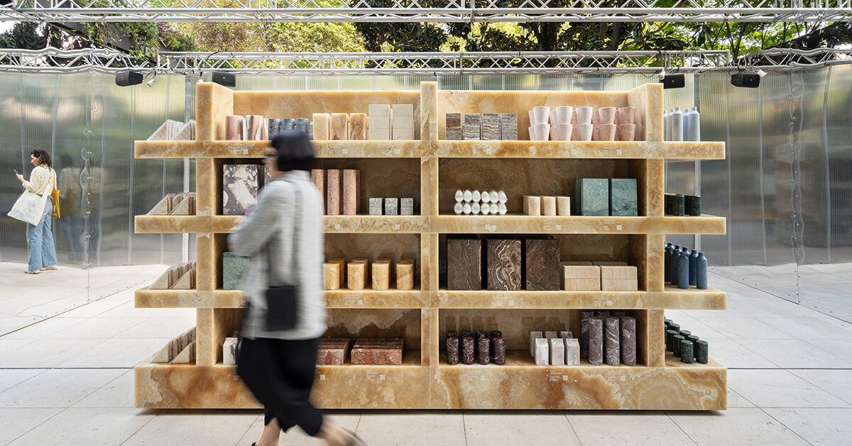 monolithic shelves carved from veined stone organize products on a gradient of material