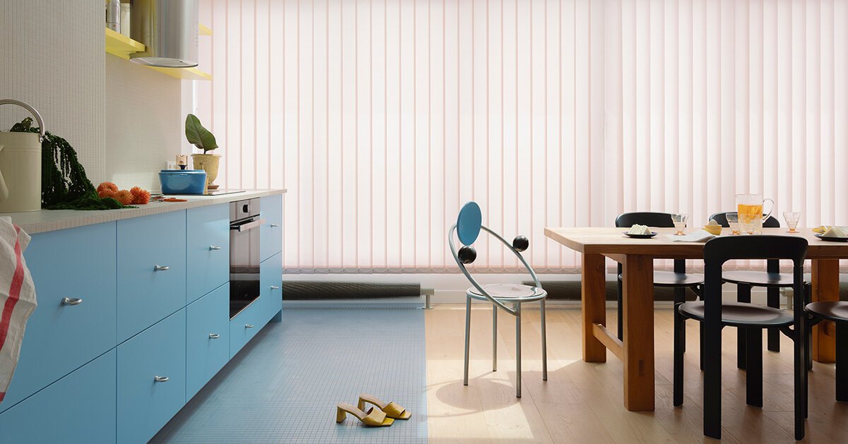 a tiled floor extends the pool-inspired palette into the kitchen area