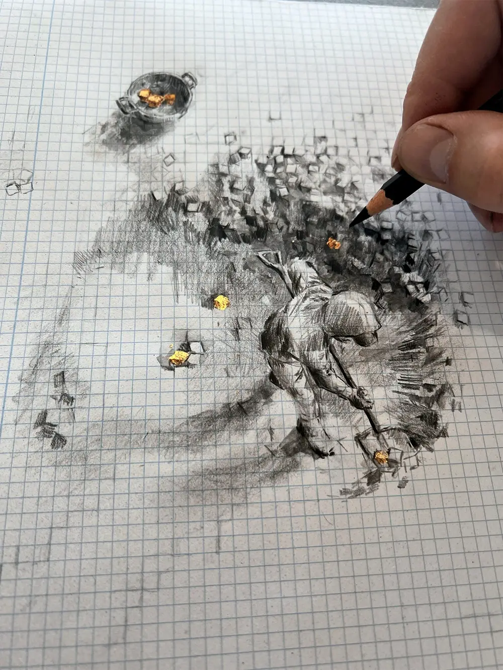 In his latest series of graphic papers, the grid becomes more than just a guide. it becomes the subject itself. Imagine a construction worker using a sledgehammer to carve out the Sistine Chapel’s iconic “Creation of Adam” arms, sending “cubic” debris flying along the spiral bond. Or a lone miner digging deep into the paper to find hidden nuggets of gold. It’s a great way to play with perception, turning a flat card into a world of depth and movement.
