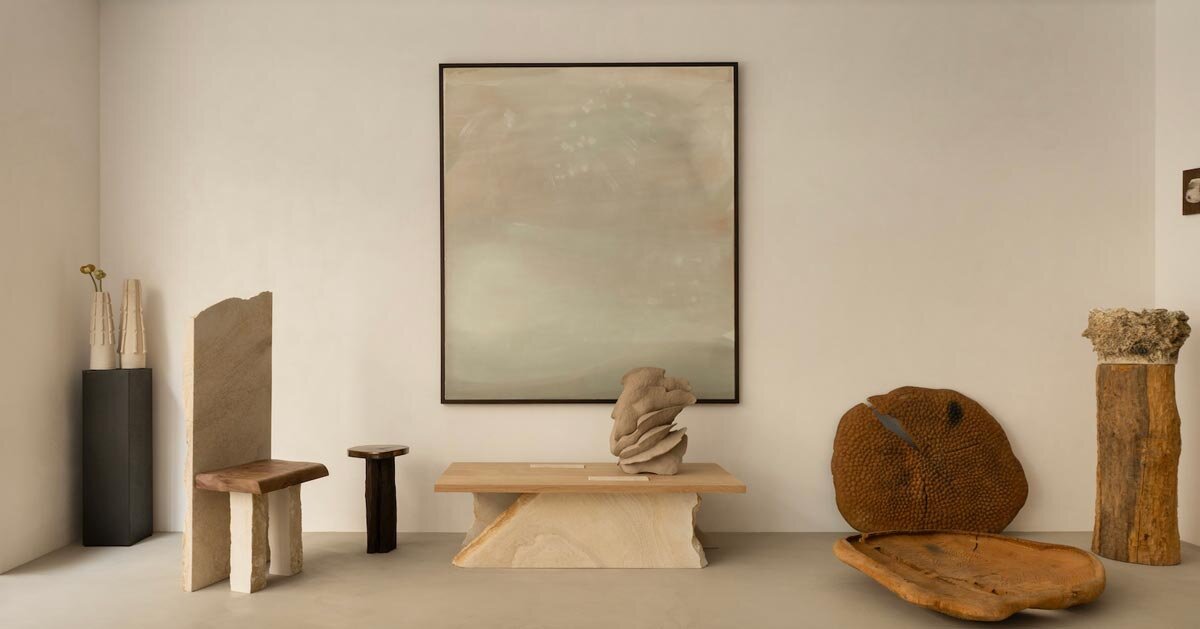SM Bureau presents “Rebirth” on Paris as a spatial composition of a collection design, where the objects in wood, stoneand ceramic define the space they live in. THE report explores how material and light interact to create atmosphere and perception. Rather than a conventional depiction, the work has been conceived as a built environment, where each piece functions as part of a larger spatial system. Furniture, sculptural objects and wall works are placed with attention to proportion, spacing and alignment, creating a quiet and immersive environment between stoa and interior. Material transformation is at the core of the exhibition. Stone is cut into planes that retain traces of extraction, wood reveals its natural growth and irregularities, while ceramic surfaces expand, crack or crystallize during firing. These processes remain visible, allowing each object to carry the memory of its construction.