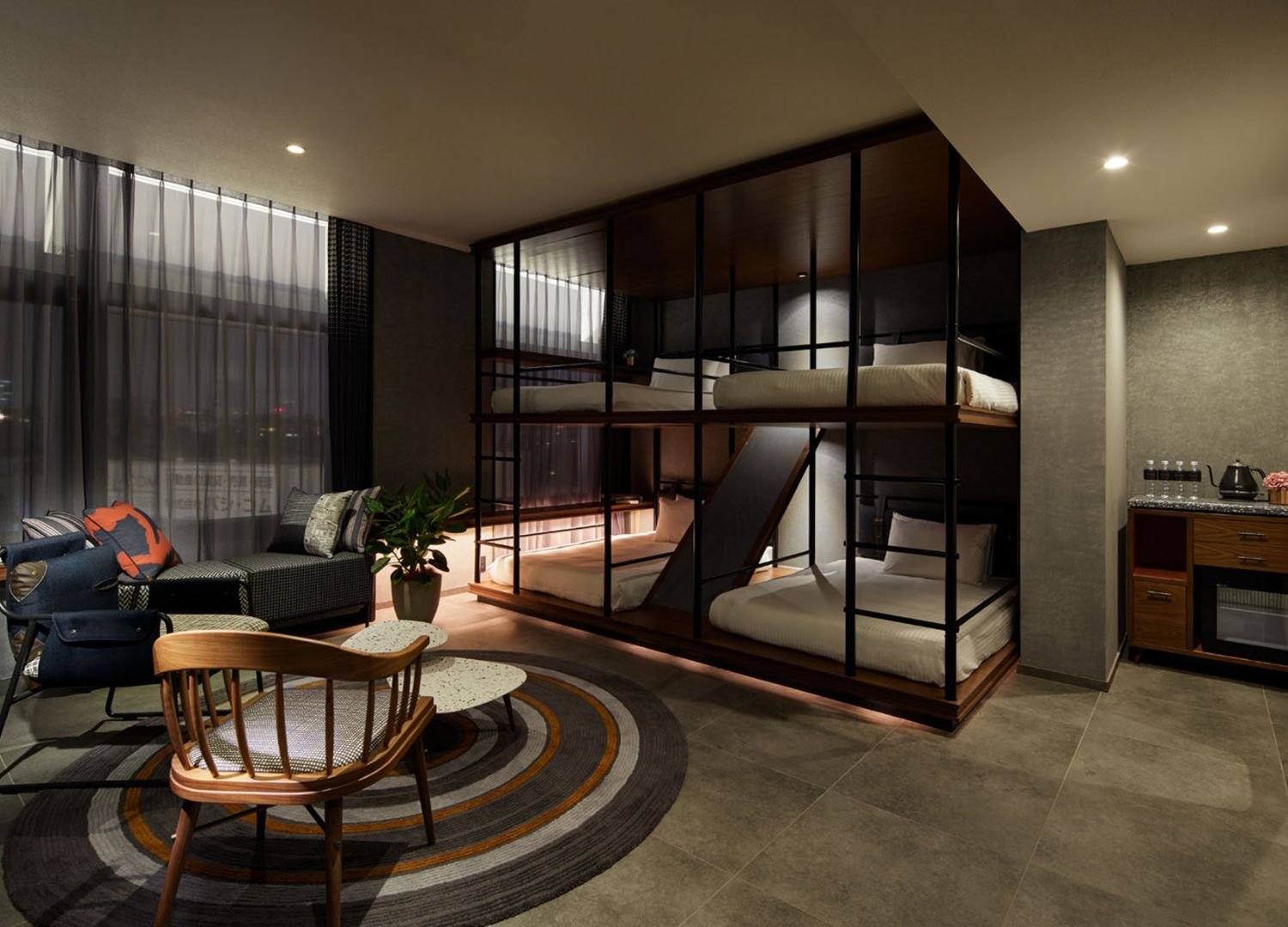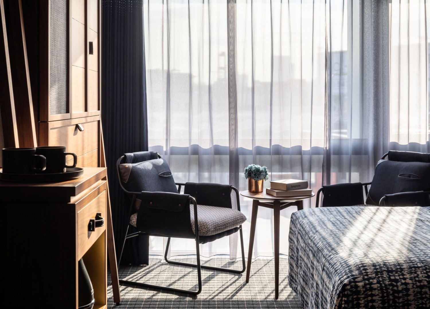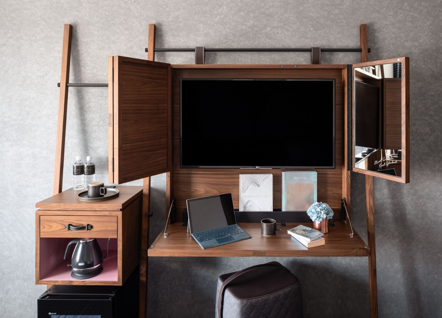 Many of the design choices revolve around customizable furniture and spatial efficiency. For example, the TV cabinet can be unfolded to become a desk, allowing the same space to serve different purposes during the day. Concealed seating and built-in storage help keep rooms open and uncluttered, while maintaining the comfort expected of a boutique hotel. Even within a compact footprint, we ensured that the shower, toilet and wash area remained independent and equipped each room with large 30cm pocket mattresses from SERTA to prioritize rest and comfort.