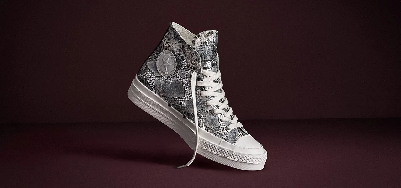 This season focuses on three materials that change the character of the shoe through surface and texture. Premium leather it offers the most reduced expression, allowing the construction and proportions of the silhouette to remain fully visible. The material defines the shoe through its quality and finish, emphasizing the construction itself. Snake Print Leather introduces a design with an aluminum foil finish that creates variation across the surface, adding depth while maintaining a tonal look. Croc Print Leather it focuses on texture, bringing a bolder surface while staying grounded in the established Chuck Taylor shape.