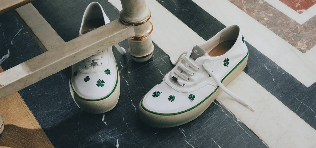 The choice of material defines the range, with each version offering a different interpretation of the design. Options include black and vintage Dior Oblique jacquard, as well as gray and green nubuck. Additional variations appear on canvas, embroidered with symbols associated with the founding couturier, including four-leaf clovers and floral motifs. These details introduce graphic elements that connect the sneaker to Dior’s visual language.