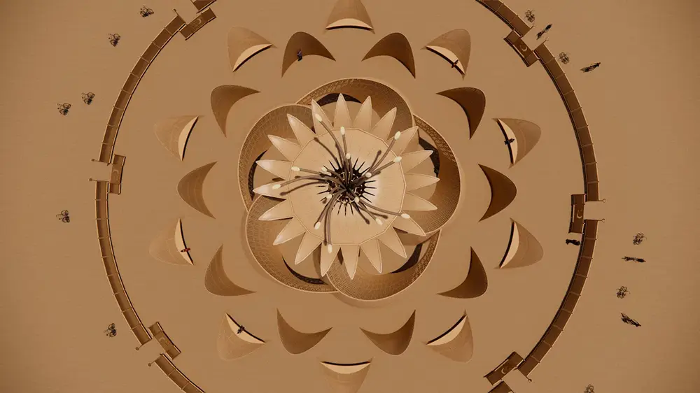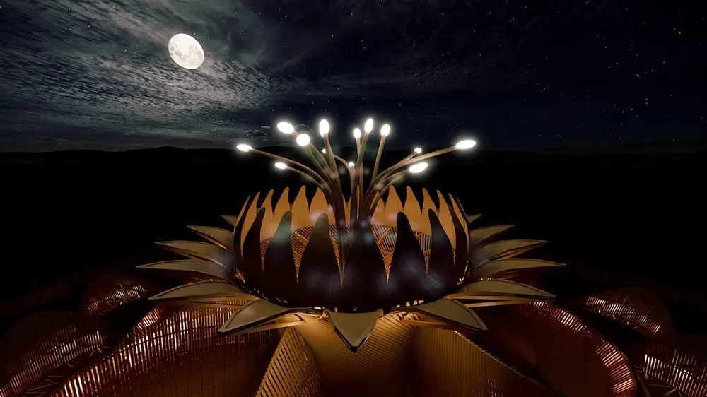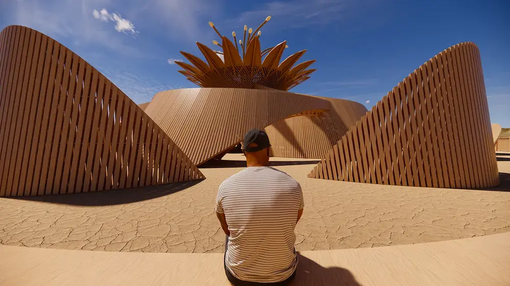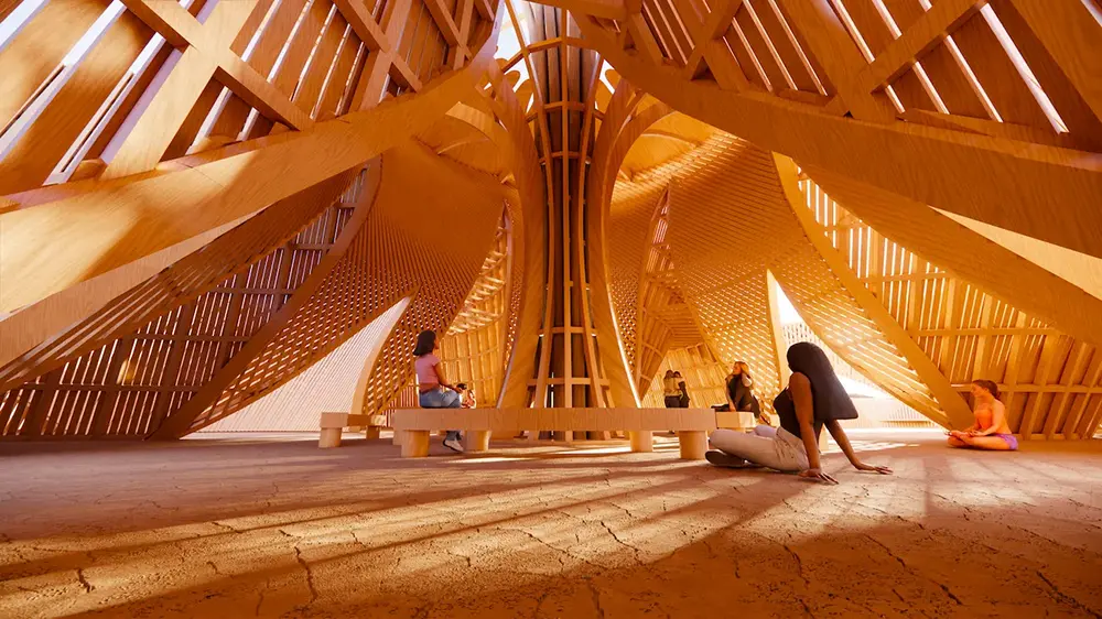 Inspired by the Queen of the Night, a rare cactus flower that only blooms for one night, the structure’s radial design mimics a short, beautiful life cycle. Using parametric modeling, Gwertzman transforms straight timbers into sweeping arcs that look like unfolded petals. Rather than an enclosed box, the Temple of the Moon filters the movement, light and sound of the desert, taking you from the open sand to a quiet, focused interior.