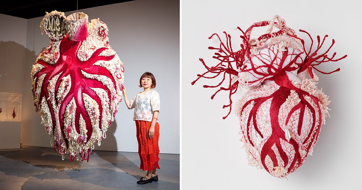 The enlarged heart reflects the same visual vocabulary found in Shin’s smaller pieces. The branching vessels appear as red embroidered paths that spread across the surface. Clusters of beads gather along the edges of these forms, creating a textured topography of threads and embellishments. The project maintains a strong sense of craftsmanship while operating within the scale of the contemporary installation.