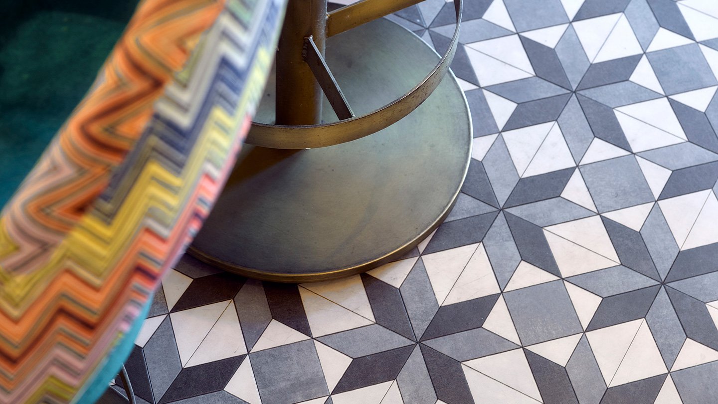 At Vittoria on the Bridge, luxury Amtico Signature vinyl tile was chosen to complement the new contemporary palette. Warm light timbers in a French Weave pattern introduce a classic yet modern rhythm beneath the blue geometric walls and brass accents. Around the bar, a combination of modernist Lintel, Diffusion Loam and Stucco Quartz in the Victorian Star pattern by Amtico Décor creates a dynamic zoning feature and its precision detailing echoes the restaurant’s layered textures and intricate mirrors.