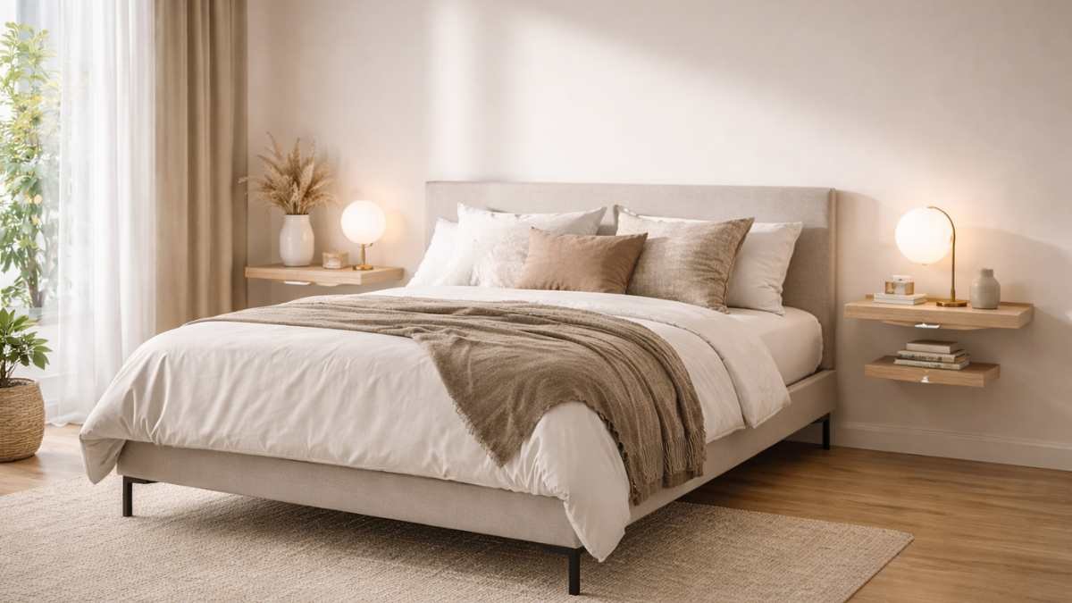 Imagine a room in neutral tones, with gray or warm white walls, a light fabric bed and light colored curtains. Placing a thin shelf in the same color as the wall creates continuity and almost disappears. The result is clean, essential, very close to a modern minimal aesthetic.