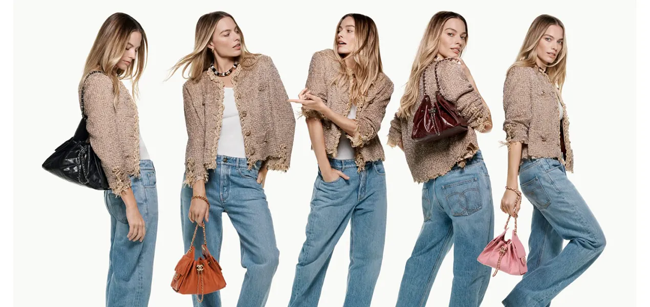 The film follows Robbie as she encounters multiple versions of herself moving down a Parisian street. Each version carries a different iteration of the CHANEL 25 bag, creating a sequence that reflects variation within consistency. The narrative is kept simple, allowing repetition of movement and style to define the structure of the campaign.