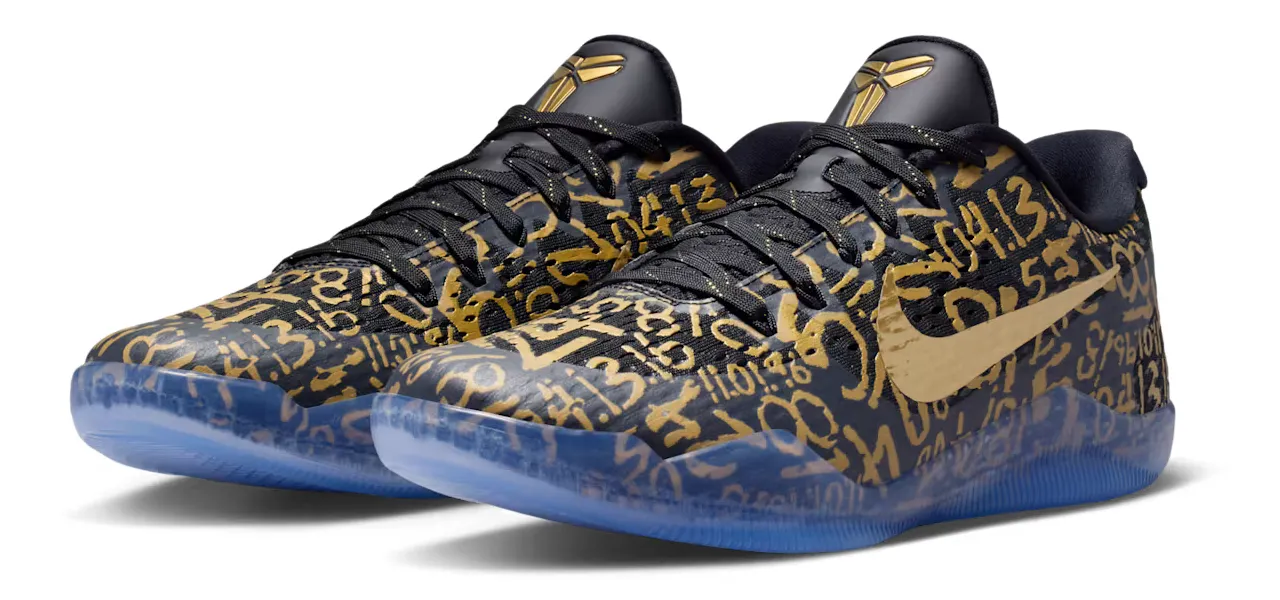 The Kobe 11 Protro Mamba Day comes in a black mesh construction with metallic gold numerology references on the upper. These graphics highlight important moments in Kobe’s career, including his 81-point game, five championships and 18 All-Star appearances.