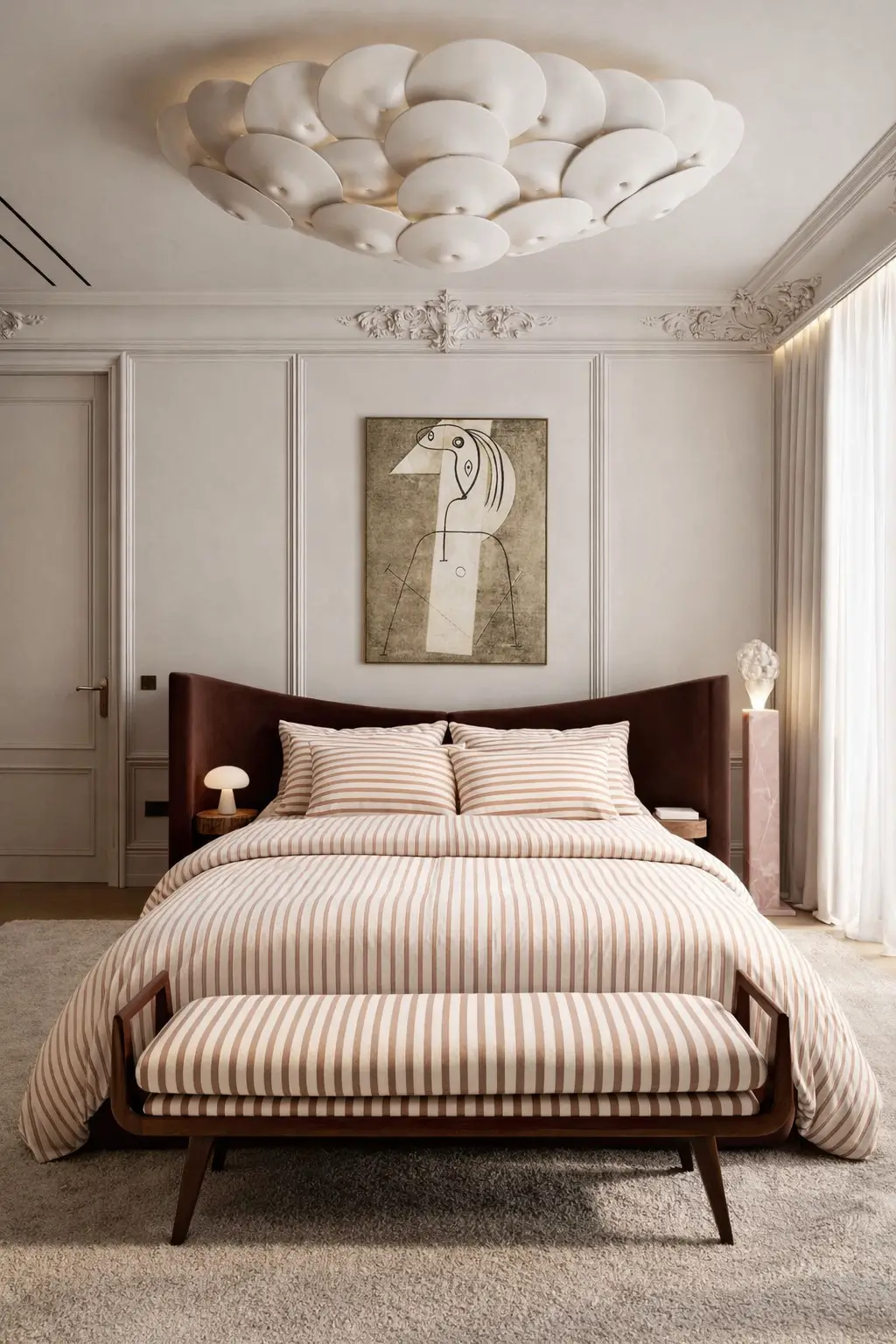 The coral-toned stripe adds warmth without overwhelming the space, which is why it works in both minimal and multi-level bedrooms.