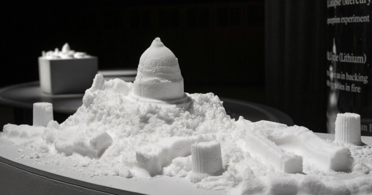 in Substance of Power, the designer creates architectural miniatures that crumble under piles of sand and cracking salt
