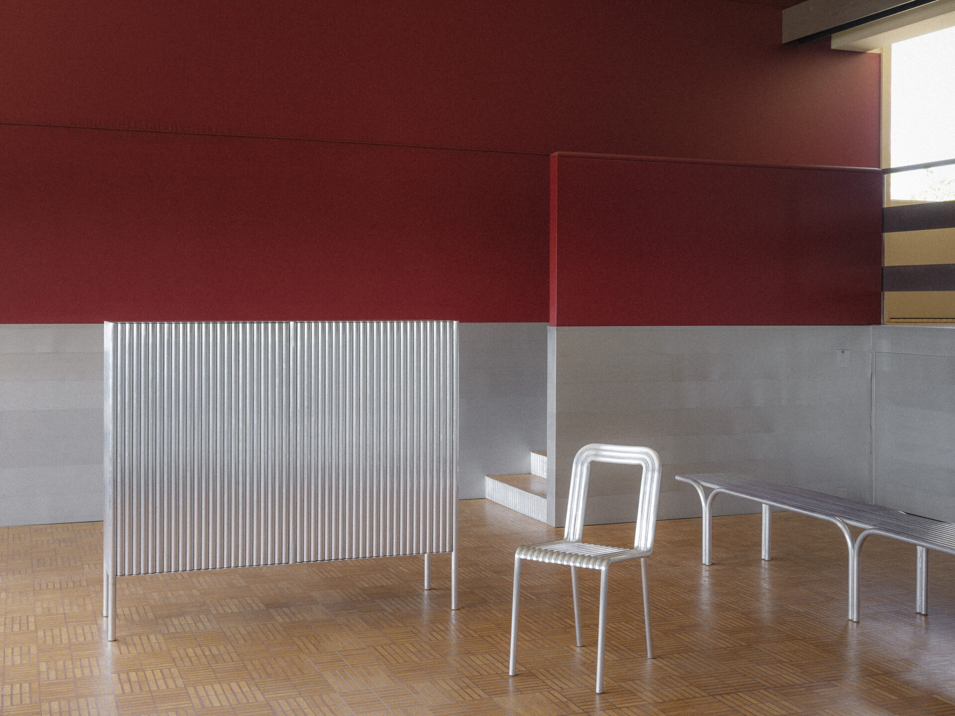 Unlike many modern studios that rely heavily on digital rendering, the duo spends a huge amount of time prototyping in-house. This natural research is perfectly integrated into the Alltubes collection. Here, the “tube theory” is pushed to its limits: the chairs and cabinets are formed by a rhythmic repetition of aluminum tubes, where the structure itself becomes the shape. There are no visible joints. The object exists as a single, repeated gesture. This same logic applies to the Wire collection, where a simple stainless steel mesh supports the transparent weight and remains transparent to the air.