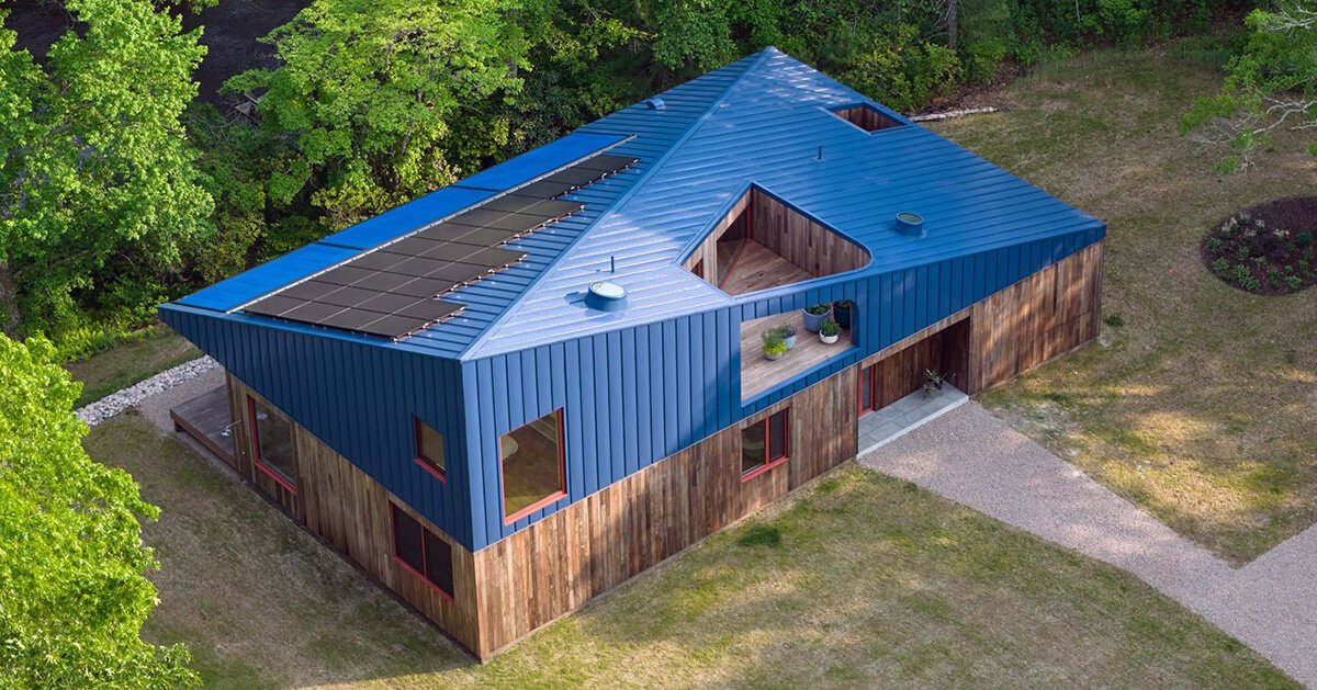 The multifaceted blue roof incorporates solar panels into its sculpted geometry