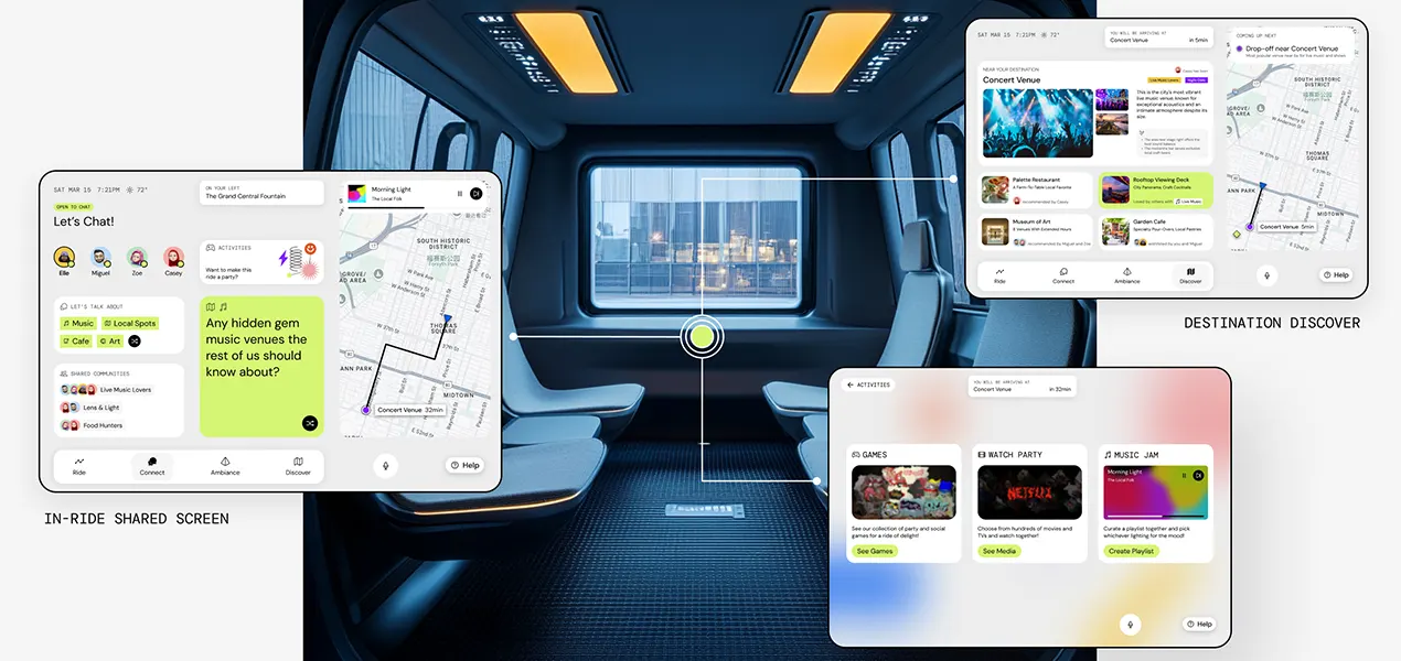 CoMove is organized around four experiential pillars, Ride, Connect, Ambiance and Discover, each shaping a different dimension of how passengers experience travel. The in-vehicle experience is based on a challenge that most designers will ignore: how a system can create the conditions for authentic conversation without designing it. Ambient-aware social prompts, shared ambience controls for lighting, temperature, and sound, and a community architecture that extends the ride into permanent relationships together treat the vehicle interior as a social environment rather than an auxiliary mode of transportation. The measure of design is not what people see on a screen but the quality of presence they feel in a shared space.